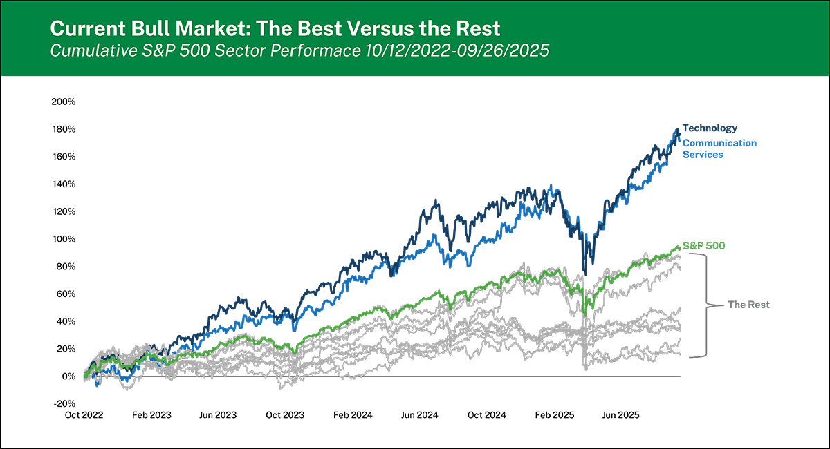 Broader participation at the individual stock and sector level typically reflects a “healthier” equity environment—one better positioned to sustain gains over time. However, today’s market remains highly concentrated, with a handful of mega-cap, AI-driven companies accounting for a disproportionate share of overall performance. This extreme concentration serves as both an opportunity and a warning sign should the prevailing growth narrative or related capital expenditures fail to meet lofty expectations.